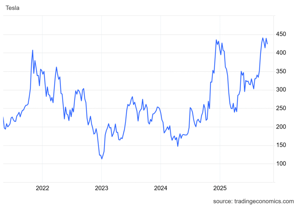 Výkonnost ceny akcií společnosti Tesla za posledních pět let* Zdroj: TradingEconomics