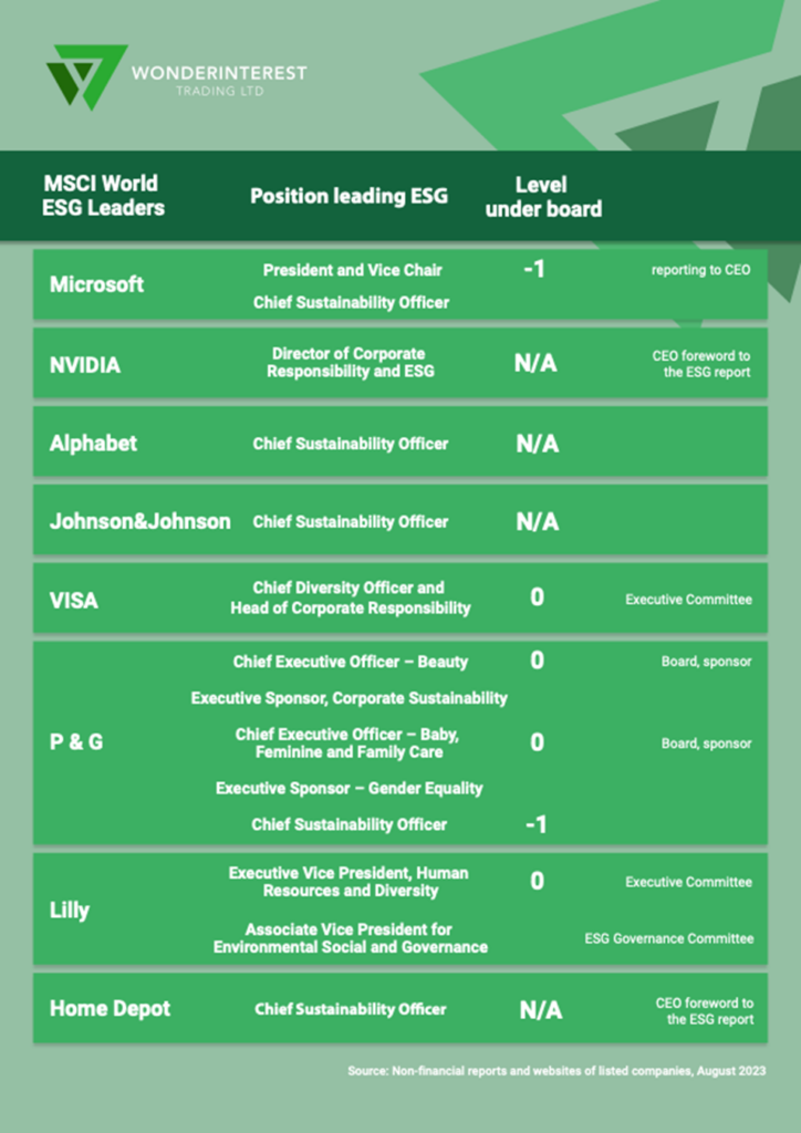 Wonderinterest Trading však ve své analýze investování ESG zkoumá nejen finanční výkazy podniků zařazených do indexu, ale i kvalitu jejich nefinančního reportingu. Jedním z faktorů, jak berou udržitelnost a společenskou odpovědnost vážně, je i přímá zodpovědnost top managementu za danou oblast. Nedávno jsme se podívali detailněji na TOP 10 zmíněného indexu MSCI World ESG Leaders a na lidi, kteří zastávají vysoké funkce v řízení firemní odpovědnosti. U poloviny ze společností mají Chief Sustainability Officer. Tato pozice zpravidla reportuje vybranému členu představenstva či správní rady, anebo přímo CEO. Ani u jedné z TOP 10 však tato pozice nefiguruje v nejvyšším vedení.