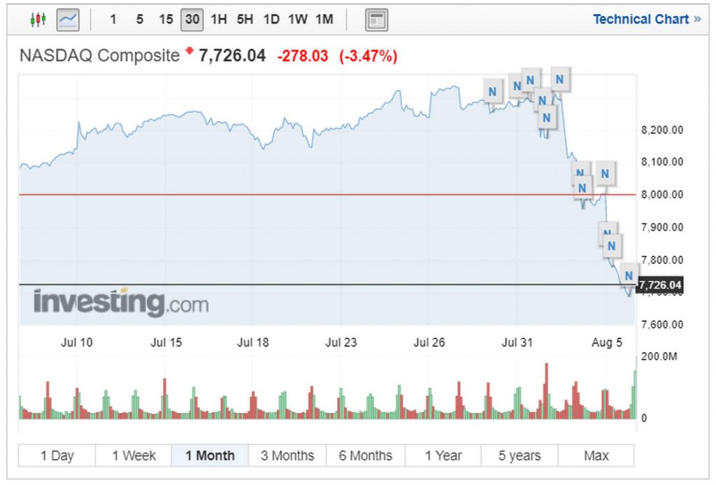 Důvodem, proč se všechny hlavní sektory ocitly v červených číslech bylo uvalení cel na dovoz dalšího čínského zboží ve výši 10 procent, o kterých koncem minulého týdne na svém Twitteru informoval americký prezident Donald Trump. Cla na zboží v hodnotě 300 miliard USD mají vstoupit v platnost již 1. září 2019. Trump, který není spokojen s výsledkem dosavadního jednání tímto způsobem zatlačil do pozadí možnost uzavření nové obchodní dohody s Čínou v době, kdy globální ekonomika vykazuje známky recese a vyvolal „paniku“ u investorů, kteří začali prodávat akcie a nakupovat dluhopisy, či drahé kovy. Ačkoli filozofií Trumpa, je udržovat trhy v zelených číslech, aktuální rozhodnutí, které je poslalo do minusových čísel z mého pohledu zřejmě souviselo s faktem, že v posledních týdnech dosáhly hlavní indexy nového maxima, a tak si i výraznější korekci spojenou s dalšími cli „mohl“ dovolit.