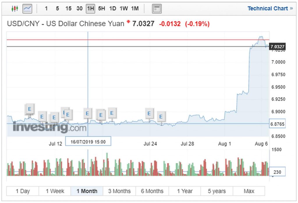 Celou situaci zhoršuje fakt, že hodnota čínského jüanu reagovala v pondělí oslabením na 7,0508 USD, což představuje nejnižší úroveň za posledních 11 let. Zároveň jde o důležitou psychologickou hranici 7 CNY za USD, což vede k obavám, že by se mohla rozpoutat i měnová válka, což by aktuální dění na trzích značně vyostřilo. Pro porovnání – ještě koncem července dosahovala hodnota měnového páru USD/CNY úrovně 6,8838.