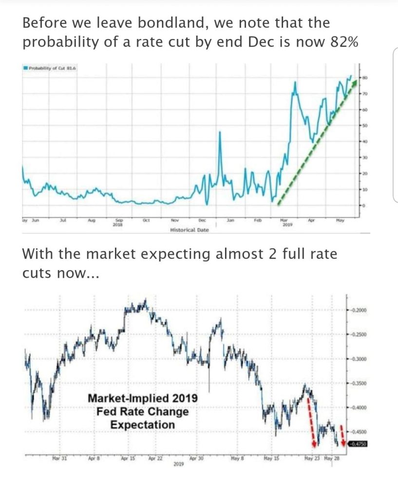 Pokud budou akcie dále klesat, je velká pravděpodobnost, že uvidíme snížení úrokových sazeb v USA, nebo i zavedení kvantitativního uvolňování. Navzdory tomu, že americká ekonomika je zralá na zvyšování sazeb, trh očekává její pokles. Podle Zerohedge je až 82 procentní pravděpodobnost, že do konce prosince 2019 uvidíme snižování sazeb. Ty se pohybují v pásmu 2,25-2,5 procenta. Trh očekává snížení téměř o 0,5 procent na úroveň 2-2,1 procenta.