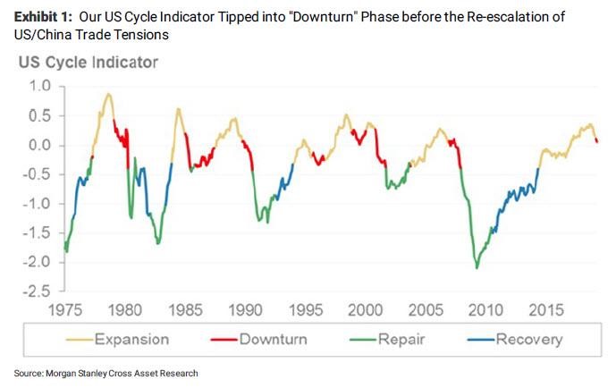Na druhém grafu vidíte pohled analytika z Morgan Stanley (Michael Wilson), který považuje tento rok za rok s vysokou šancí poklesu nebo změny cyklu – z expanze na recesi. Podle tohoto grafu se nacházíme na začátku „downturnu“. I když se jedná z jeho strany o poměrně negativní scénář, centrální banky a jejich nástroje vždy dokáží ovlivnit trhy a svým způsobem odvrátit pokles. To mohou udělat například prostřednictvím změny rétoriky, či spuštěním programu kvantitativního uvolňování.