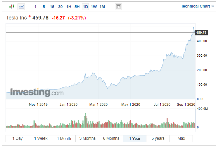 Po rozdělení akcií koncem srpna se cena jedné akcie snížila a obchodování s akciemi Tesly se tak stalo dostupnějším i pro ty, pro které byla původní cena až příliš vysoká. Během středečního obchodního dne se cena pohybovala na úrovni kolem 457 USD za akcii. Výrazný růst zaznamenala také tržní hodnota výrobce elektromobilů, která dosáhla 442,6 miliard USD.