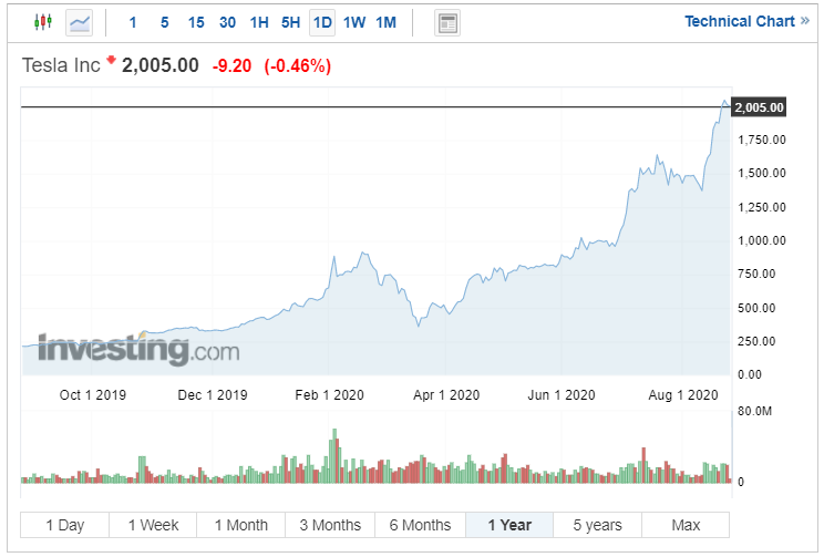 Vývoj hodnoty akcií Tesly před rozdělením (25.8.2020).