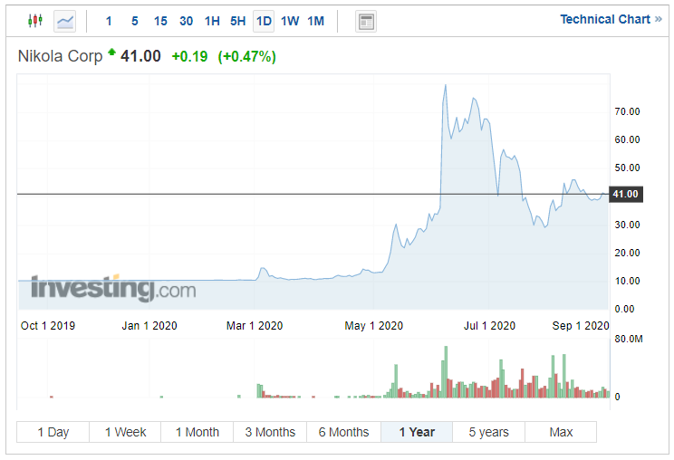Během úvodního týdne na burze vzrostly akcie Nikoly o 93 procent a tržní kapitalizace firmy dosáhla 1,9 miliardy USD. Od té doby se ale hodnota akcií výrazně „zkorigovala“. Z úrovně těsně pod 80 USD za akcii klesla ve středu (2.9.2020) na přibližně 41 USD za akcii. To představuje propad na úrovni 49 procent. Zdá se, že počáteční pozitivní euforie investorů z IPO vyprchala a akcie se postupně dostávají blízko úrovni ze začátku června.