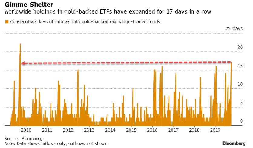 Podle serveru Bloomberg se jednalo o rekordní, 17ti denní, postupný nárůst přílivu peněz do zlata od finanční krize. Jak ukazuje graf, podobný přítok kapitálu jsme mohli zaregistrovat v letech 2016 a 2012. Graf znázorňuje počet za sebou jdoucích dní přílivu kapitálu do zlatých ETF po roce 2009.