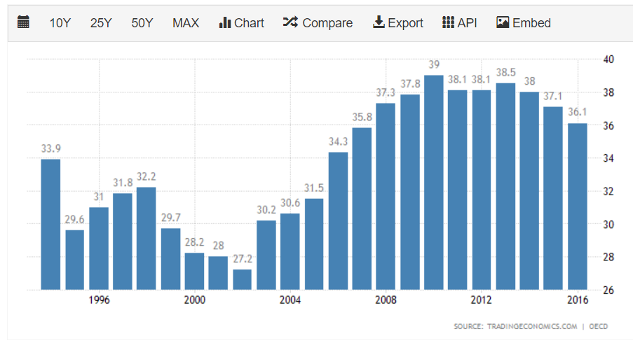 Dalším faktorem, k němuž je potřeba přihlédnout je, že Čína je aktuálně největším exportérem zboží na světě. Podíl vývozu na globálním exportu dosáhl podle World Trade Organization v roce 2017 téměř 13 procent. Pro porovnání – v roce 2001 to byly 4 procenta. Mzdy v zemi však nestačily navzdory postupnému růstu držet tempo s exportem a vedly spíše k prudkému růstu úspor domácností, které se podle údajů z OECD zývšily z 28,2 procenta v roce 2000 na 39 procent v roce 2010 a stále zůstávají relativně vysoko. Jenže populace v zemi stárne, což směřuje tento trend k tomu, že lidé začínají utrácet více než naspoří, a následně tlačí výši úspor směrem dolů. Poslední čísla dokládají 36,10 procenta v roce 2016.